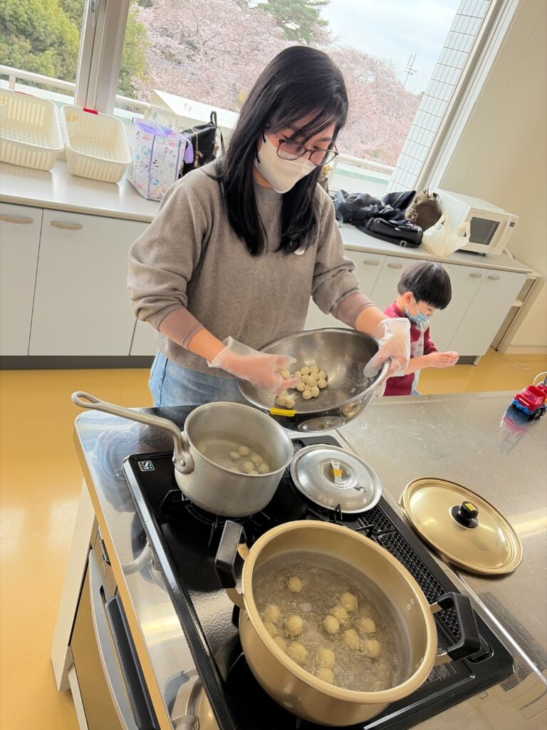 お団子をお湯の中にいれ、浮いてきたらあと少し!