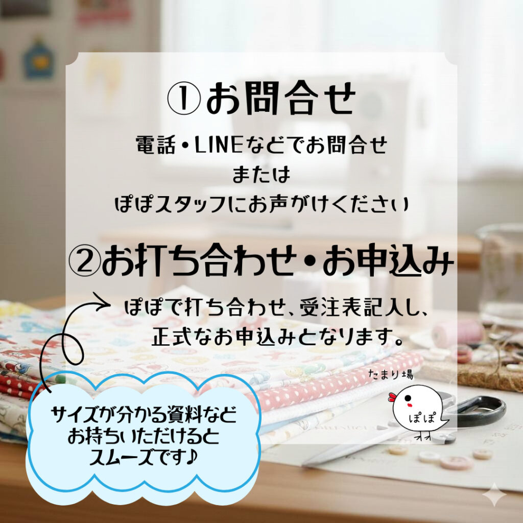 布の大きさや素材、パーツなど何を買っていいか分からない…という場合もご安心ください。打ち合わせ時にスタッフが教えてくれます^^