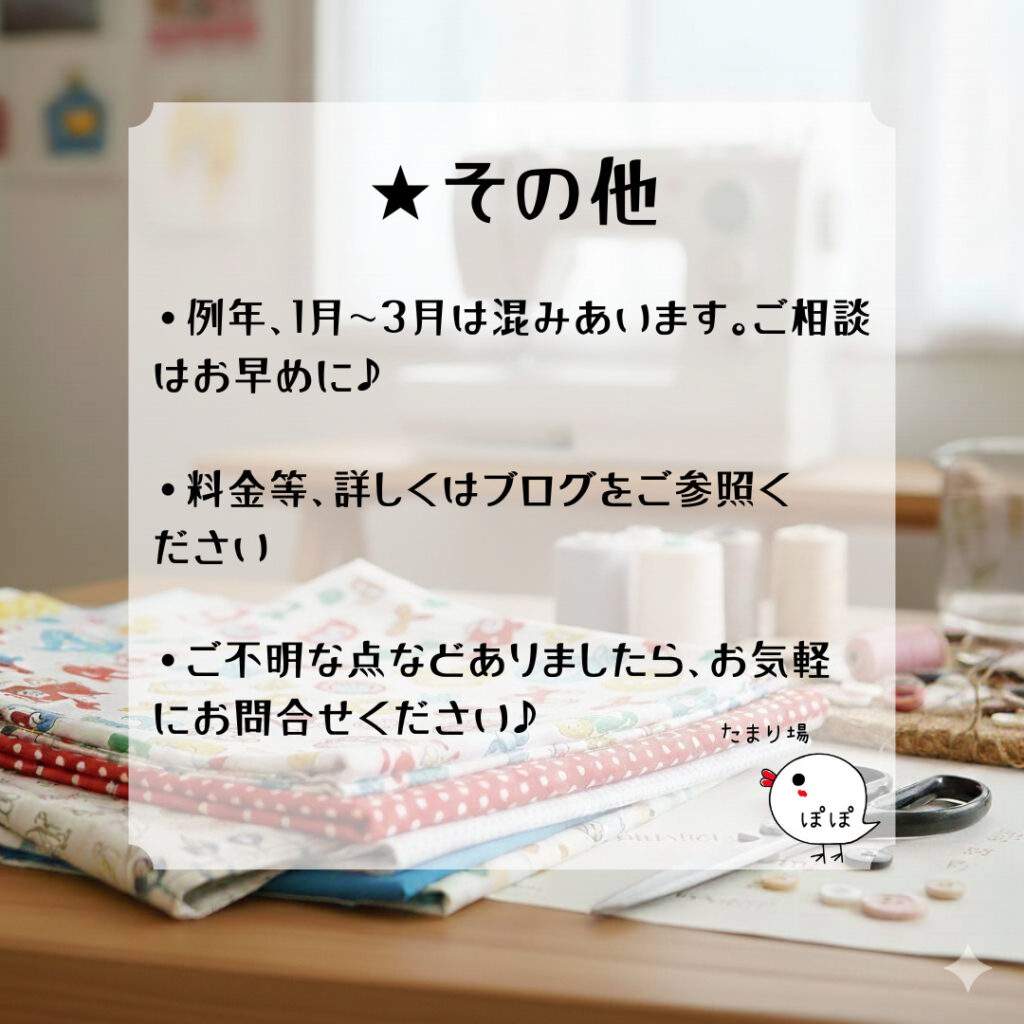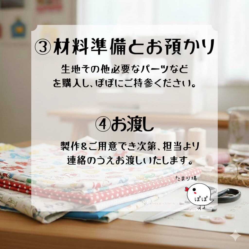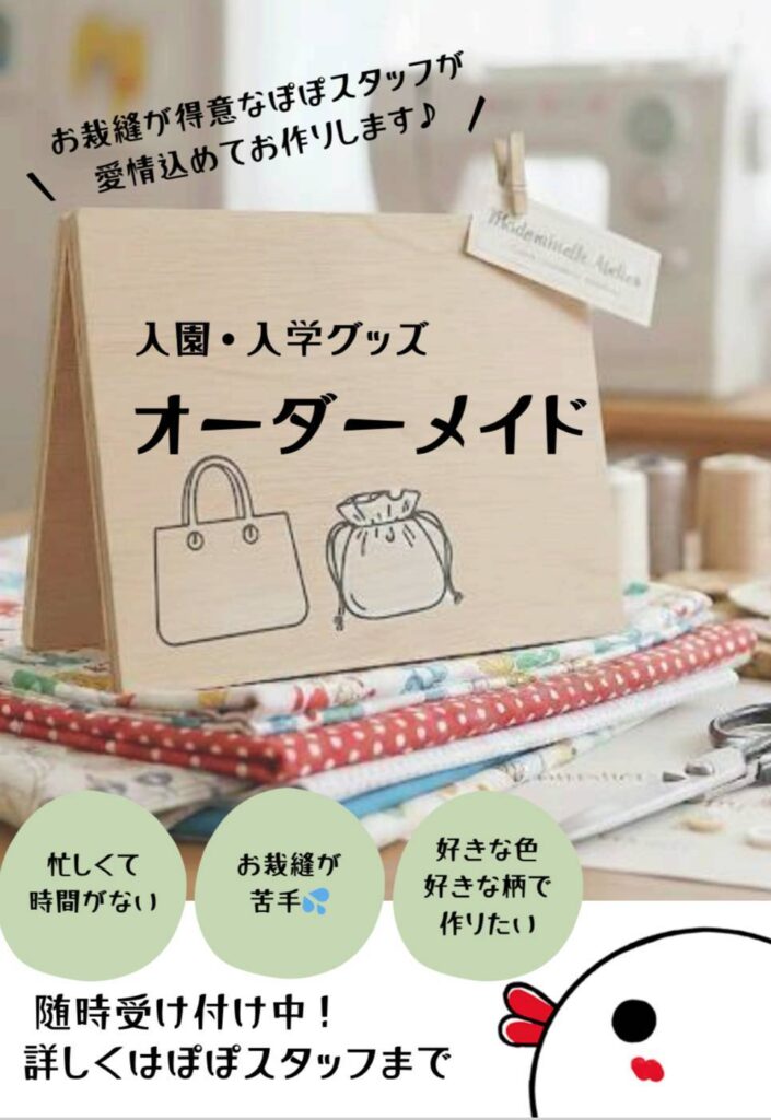 たまり場ぽぽでは、入園入学グッズのオーダーメイドを承っております。お裁縫が得意なぽぽスタッフが、心を込めてお作りします✨